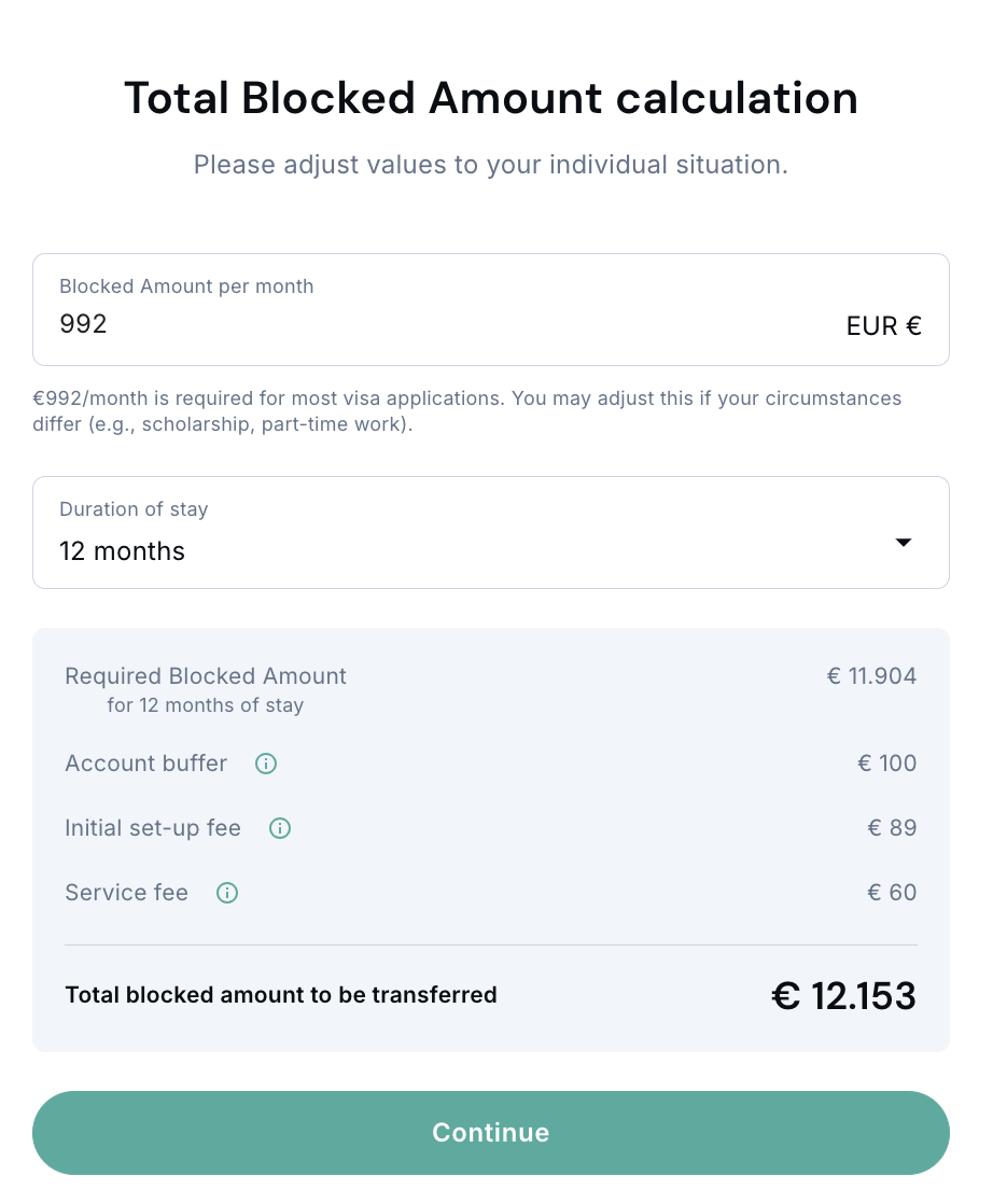However, if you have already confirmed with your visa-issuing authority that you need to block more or less than €992 per month because of a scholarship or any other reason, you can adjust the amount as per your needs.
