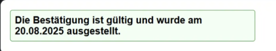 The system will show:“Die Bestätigung ist gültig und wurde am XX.XX.XXXX ausgestellt.”