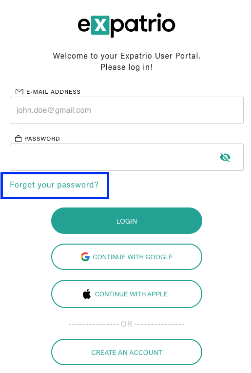 Şifrenizi (password) de unuttuysanız, lütfen Expatrio Uygulamasının oturum açma ekranında "Şifrenizi mi unuttunuz? (Forgot your password?)" seçeneğine tıklayın.